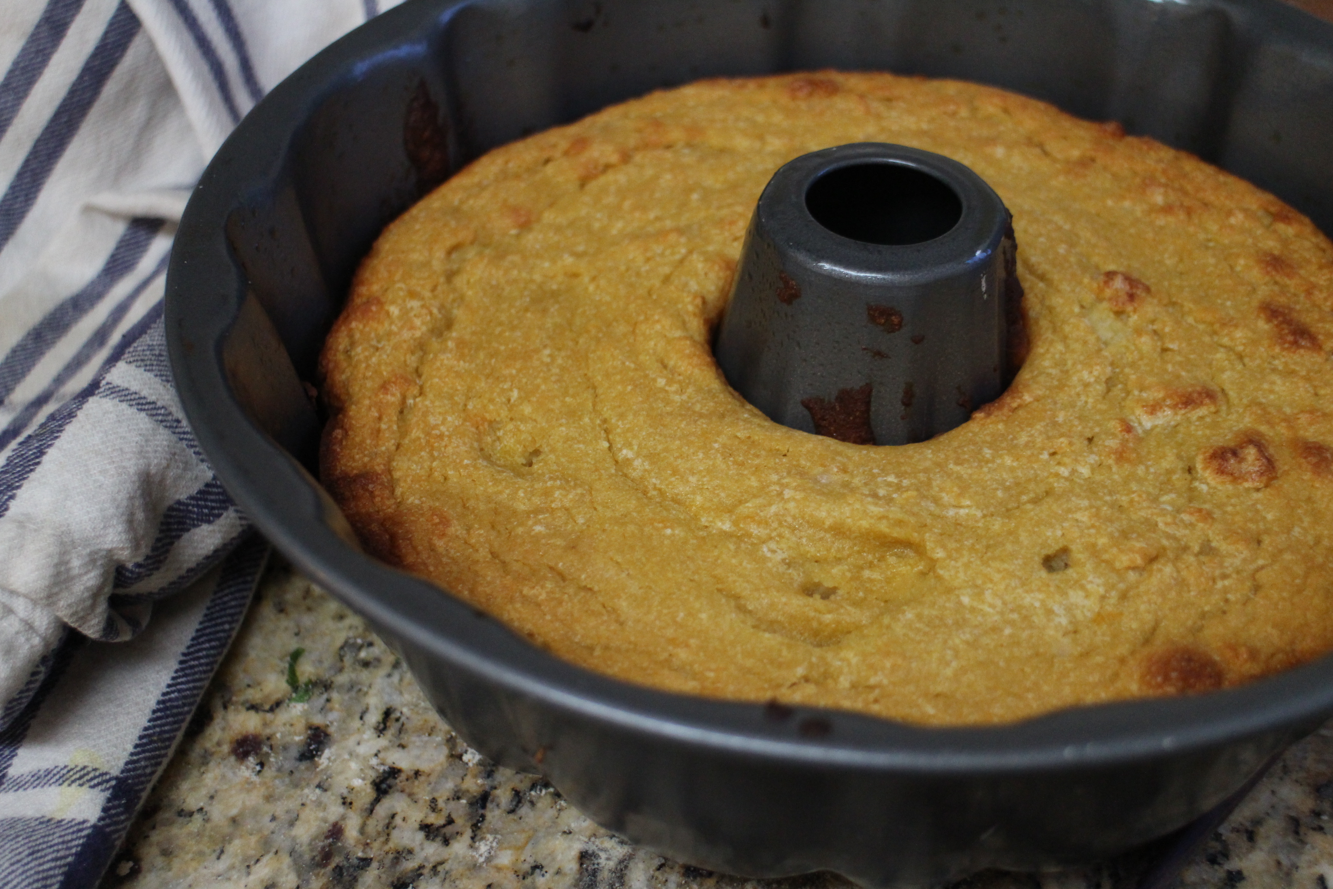 6. Pour the batter into the prepared bundt pan.  Bake for 35-4o minutes, until cake is golden brown and a toothpick inserted into the center comes out clean.